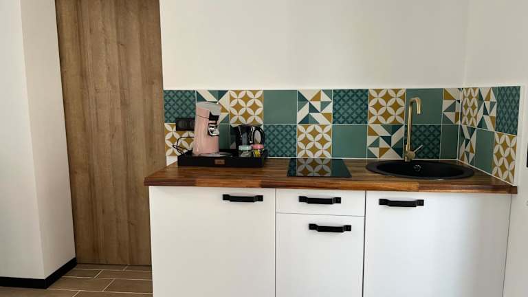 Die Ferienwohnung verfügt über ein Schlafzimmer, einen Flachbild-TV mit Kabelkanälen sowie eine voll ausgestattete Küche mit Kühlschrank und Herdplatte. Handtücher und Bettwäsche werden bereitgestellt.