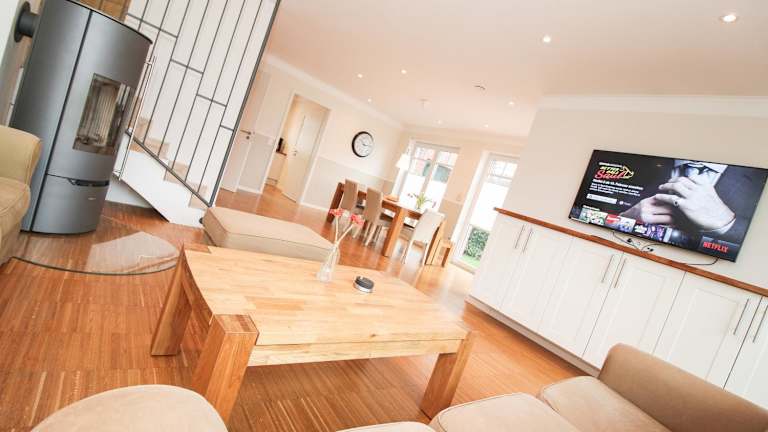 Die Ferienwohnung umfasst drei Schlafzimmer, ein Wohnzimmer und eine komplett ausgestattete Küche mit Kühlschrank und Kaffeemaschine. Es stehen drei Badezimmer mit Dusche und Haartrockner zur Verfügung. Handtücher und Bettwäsche werden bereitgestellt, und in der Unterkunft sind allergikerfreundliche Zimmer verfügbar.
