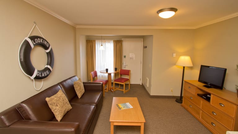 Die Zimmer im Looking Glass Inn sind geräumig und komfortabel gestaltet, um den Gästen einen angenehmen Aufenthalt zu bieten. Jedes Zimmer verfügt über kostenfreies WLAN, einen Flachbild-TV, einen Kühlschrank, eine Mikrowelle und eine Kaffeemaschine. Die meisten Zimmer bieten einen schönen Blick auf die Bucht oder das Meer. Einige der Suiten im Hotel sind zusätzlich mit einer Whirlpool-Badewanne und einem Gaskamin ausgestattet, um den Gästen noch mehr Komfort und Entspannung zu bieten.