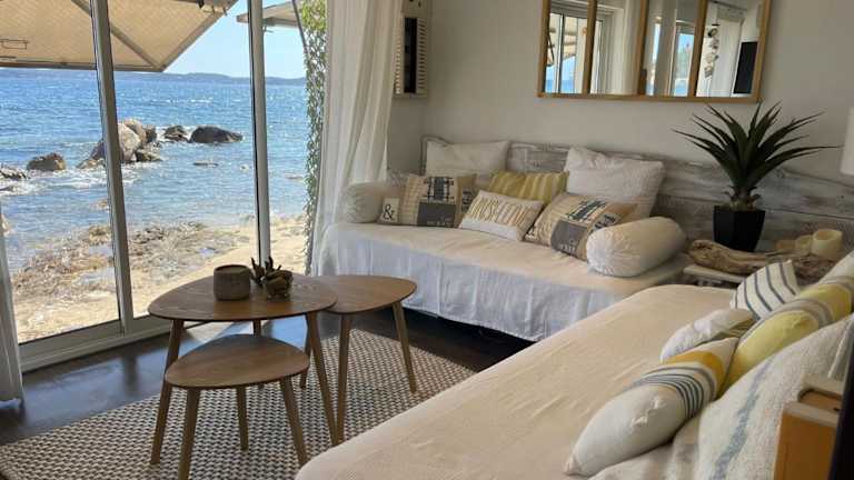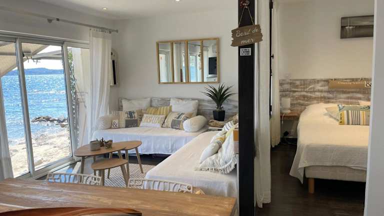 Lou cabanou bietet Übernachtungsmöglichkeiten mit einer Terrasse oder einem Balkon. Die Unterkunft verfügt über einen Garten und einen eigenen Strandbereich.
