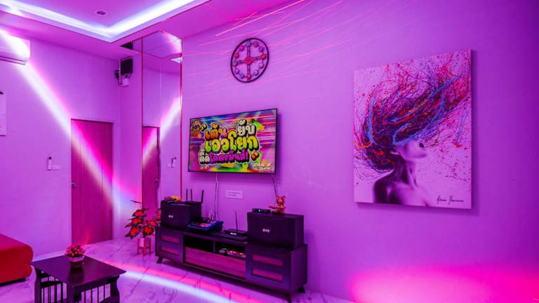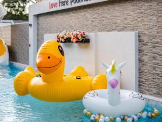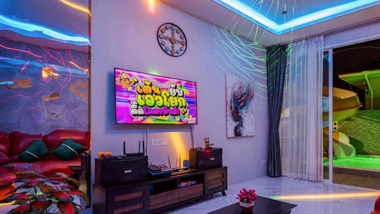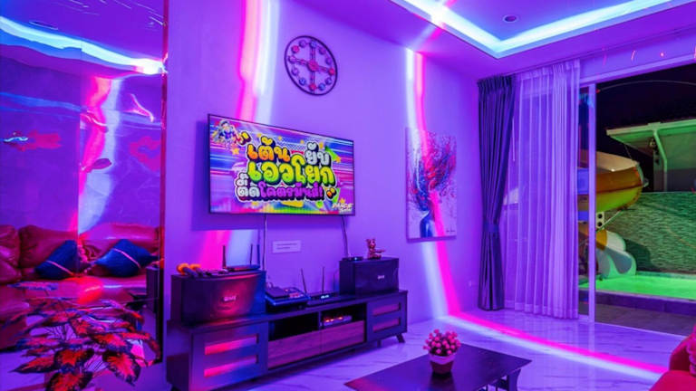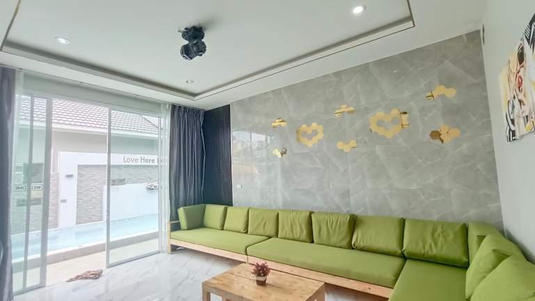 Love Here Poolvilla หัวหิน bietet Übernachtungsmöglichkeiten in einer Villa mit kostenfreiem WLAN, einem Außenpool, einem Garten und einer Gemeinschaftslounge. Zur Ausstattung der Villa gehören eine Terrasse und ein beeindruckender Stadtblick.