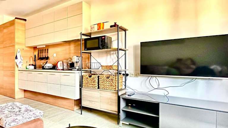 Die Ferienwohnung umfasst ein Schlafzimmer, ein Wohnzimmer und eine voll ausgestattete Küche mit Kühlschrank und Kaffeemaschine. Zudem gibt es ein Badezimmer mit Dusche und kostenlosen Pflegeprodukten. Handtücher und Bettwäsche werden bereitgestellt. Klimatisierung ist ebenfalls vorhanden.