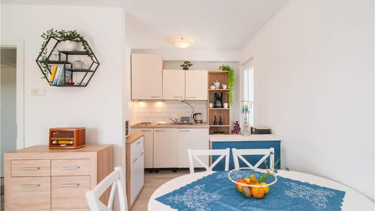 Das Ferienhaus ist mit einer voll ausgestatteten Küche ausgestattet, die unter anderem einen Kühlschrank und eine Kaffeemaschine beinhaltet.