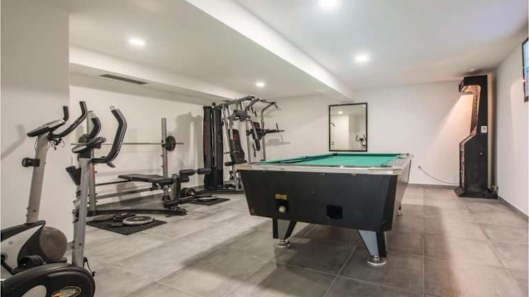 Zu den Freizeitmöglichkeiten in der Unterkunft gehören ein Innenpool und ein Außenpool. Zudem stehen Grillmöglichkeiten und eine Sonnenterrasse zur Verfügung. Das Ferienhaus ist mit einem Fitnesscenter, einem Billardbereich und Outdoorspielgeräten für Kinder ausgestattet.