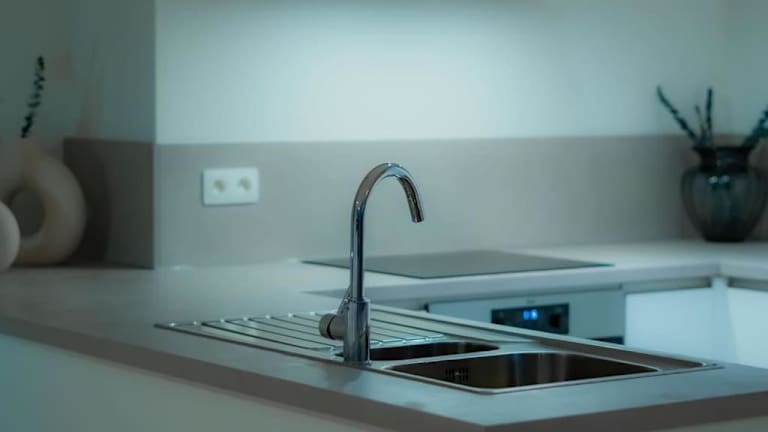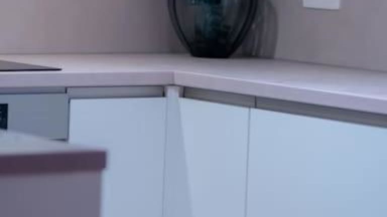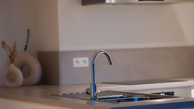 Eine voll ausgestattete Küche steht zur Verfügung und beinhaltet einen Kühlschrank, Geschirrspüler, Ofen, Kaffeemaschine und Wasserkocher.