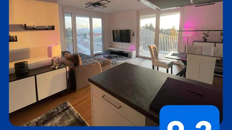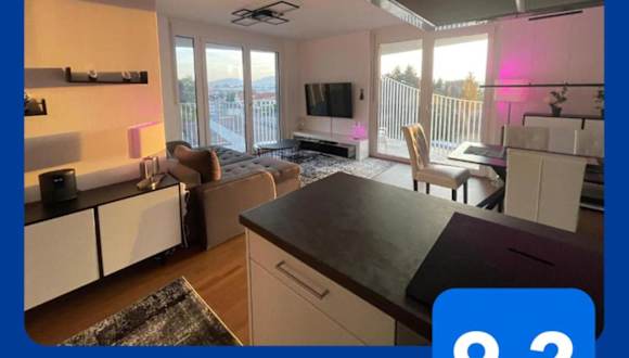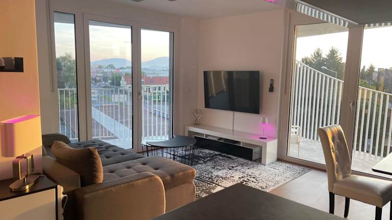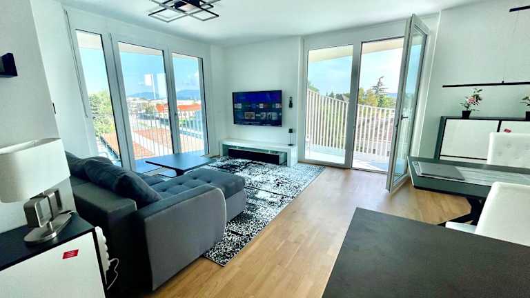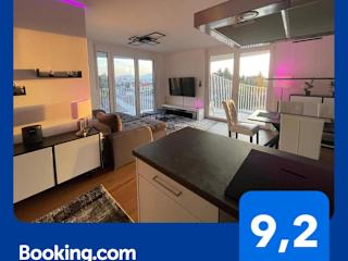 Das Luxusapartment bietet eine Fläche von 40 qm und zeichnet sich durch eine großzügige Terrasse sowie einen Balkon aus. Die Übernachtungsmöglichkeiten sind für bis zu zwei Schlafzimmer, ein Wohnzimmer und eine voll ausgestattete Küche ausgelegt. Die Kombination aus Stadtblick und Garten machen die Unterkunft ansprechend.