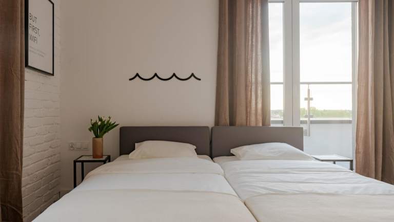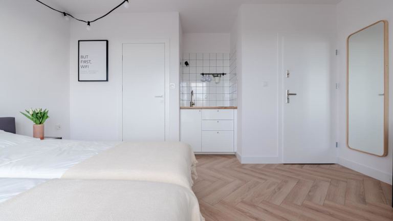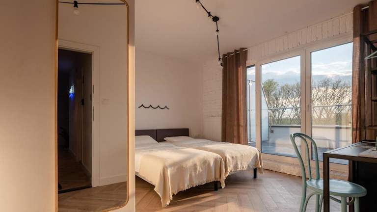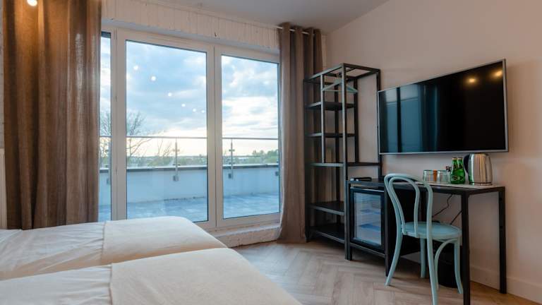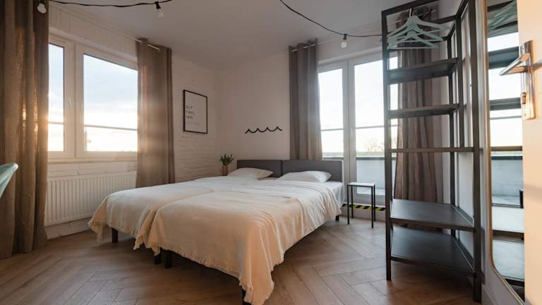 Einige Wohneinheiten der Unterkunft Łydynia verfügen über Annehmlichkeiten wie eine Terrasse oder einen Balkon mit Stadtblick.