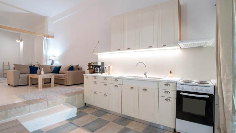 Die Ferienwohnung ist klimatisiert und besteht aus einem Schlafzimmer sowie einem Wohnzimmer. Eine voll ausgestattete Küche mit Kühlschrank und Kaffeemaschine ist vorhanden. Das Badezimmer verfügt über eine Dusche und kostenlose Pflegeprodukte. Handtücher und Bettwäsche werden bereitgestellt.