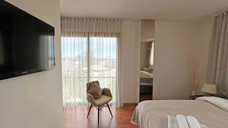 Die Ferienwohnung verfügt über zwei Schlafzimmer und ein Wohnzimmer, wo ein TV bereitsteht. Die gut ausgestattete Küche umfasst einen Kühlschrank und einen Geschirrspüler. Es sind zwei Badezimmer vorhanden, die mit einer Badewanne oder Dusche ausgestattet sind. Handtücher und Bettwäsche werden bereitgestellt und die Unterkunft bietet eine Terrasse mit Stadtblick.