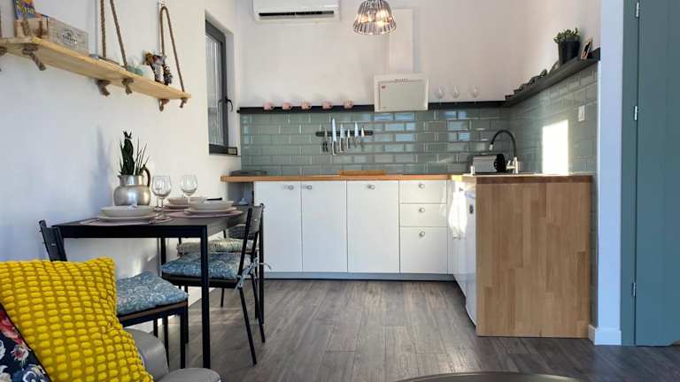 Die Unterkunft verfügt über eine Küchenzeile mit einem Kühlschrank und einem Geschirrspüler.