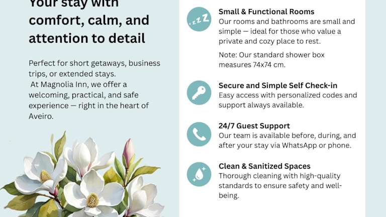 Die Unterkunft Magnolia Inn befindet sich in Aveiro, in der Nähe des Fußballstadions Estádio Municipal de Aveiro (7,8 km) und 47 km von der Burg Castelo da Feira entfernt. Zu den interessanten Orten in der Umgebung zählen die Universität Aveiro, das Kongresszentrum Aveiro und das Museu de Aveiro. Der nächstgelegene Flughafen ist der Flughafen Porto, welcher 85 km entfernt ist.