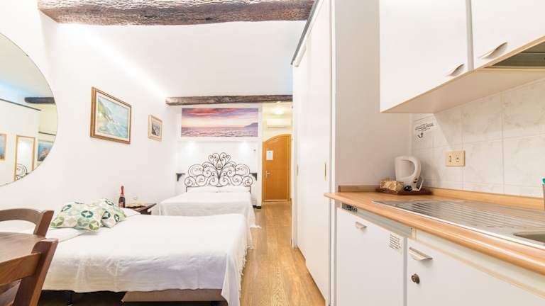 Die Ferienwohnung umfasst zwei Schlafzimmer, ein Wohnzimmer und eine voll ausgestattete Küche mit Kühlschrank und Kaffeemaschine. Zur Ausstattung gehört ein Badezimmer mit Bidet und Dusche. Handtücher und Bettwäsche werden zur Verfügung gestellt.