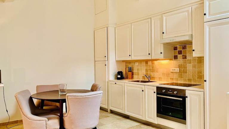 Die Wohneinheiten sind mit voll ausgestatteten Küchen eingerichtet, die einen Essbereich, Kühlschrank, Geschirrspüler, Mikrowelle, Kaffeemaschine und Wasserkocher bieten. Es gibt keine spezifischen Informationen zu Verpflegungsmöglichkeiten im Hotel.