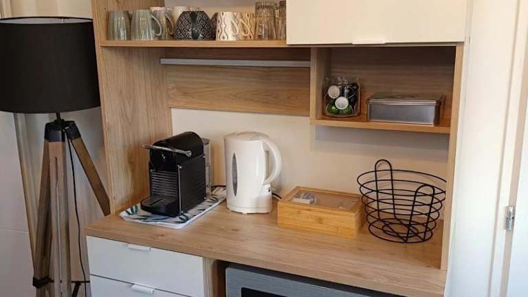 Die Ferienwohnung beinhaltet eine voll ausgestattete Küche mit Kühlschrank und Kaffeemaschine, jedoch keine Informationen zu zusätzlichen Verpflegungsmöglichkeiten.