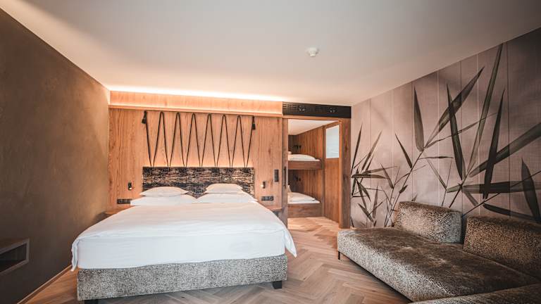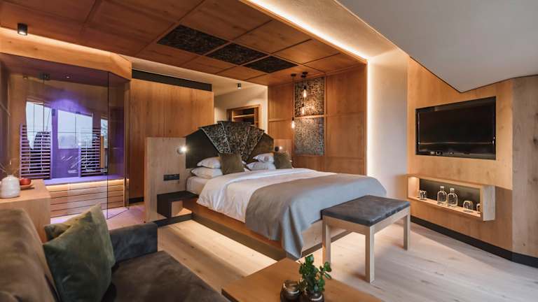 Die Zimmer und Suiten im Majestic – Unique Spa Resort vereinen stilvolles Design, hochwertige Materialien und großzügigen Wohnkomfort. Schon die Standardzimmer bieten ab 40 m² viel Raum zum Entspannen – mit warmen Farben, edlen Stoffen und einem traumhaften Blick auf die Südtiroler Bergwelt. Besonders luxuriös präsentieren sich die neuen Suiten, einige davon mit privatem Whirlpool oder Infrarotkabine, für alle, die sich noch mehr Exklusivität und Privatsphäre wünschen. Familien genießen in den großzügigen Familiensuiten mit getrennten Kinderzimmern maximalen Komfort und Rückzugsraum – ideal für gemeinsame Auszeiten mit den Liebsten. Alle Zimmer sind elegant ausgestattet, verfügen über Balkon oder Terrasse, edle Bäder, moderne Technik und liebevolle Details, die das Majestic so besonders machen. Hier trifft alpiner Stil auf zeitlose Eleganz – für ein Wohnerlebnis, das pure Erholung verspricht.