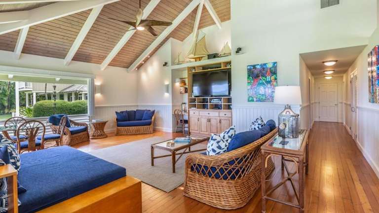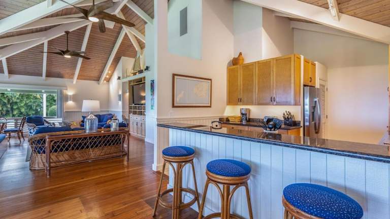 Das Makana Nui Home verfügt über 3 Schlafzimmer, die Platz für eine größere Gruppe bieten. Die klimatisierten Zimmer sorgen für angenehme Temperaturen, während die gut ausgestattete Küche mit einem Backofen und einem Geschirrspüler ideal für die Zubereitung eigener Mahlzeiten ist. Im Ferienhaus gibt es auch einen gemütlichen Sitzbereich und 3 Badezimmer mit Dusche. Handtücher und Bettwäsche werden gestellt, sodass Sie sich um nichts kümmern müssen.