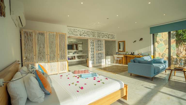 Das Mandalina Suites Luxury Boutique Hotel bietet geräumige und komfortable Suiten mit moderner Ausstattung. Jede Suite verfügt über einen Flachbild-Kabel-TV und einen eigenen Sitzbereich, der zum Entspannen nach einem ereignisreichen Tag einlädt. Einige Zimmer bieten auch eine Terrasse oder einen Balkon mit Blick auf das Meer. Das Bad ist mit kostenfreien Pflegeprodukten und einem Haartrockner ausgestattet. WLAN und Privatparkplätze stehen Ihnen in diesem Hotel kostenlos zur Verfügung.