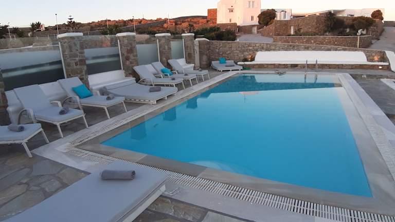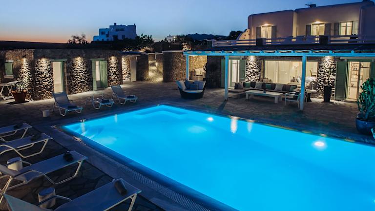 Die Mando Pool Villas w Sea Views - Five Bedrooms liegen 400 m vom Super Paradise Beach entfernt. Zum Flughafen Mykonos sind es 3 km. Die malerische Altstadt von Mykonos sowie der Hafen sind nach 1,6 km zu erreichen. In der Nähe finden sich ein Restaurant, eine Café-Bar und ein Supermarkt.