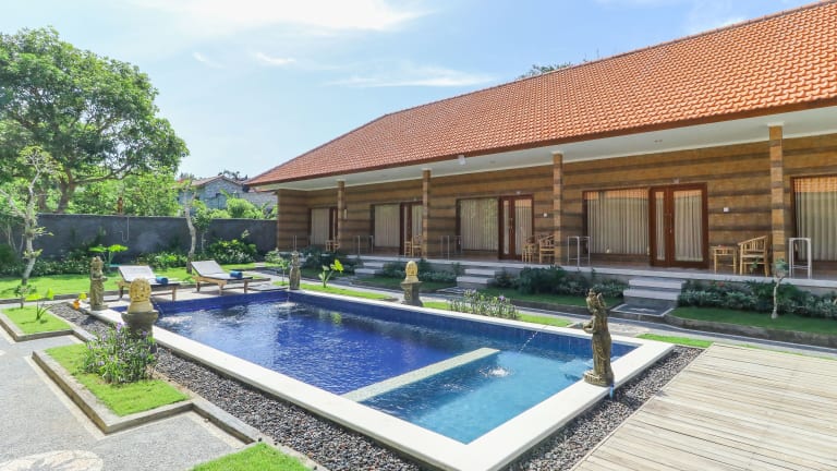 Das Hotel Manik Homestay by ZUZU in Uluwatu ist eine freundliche Unterkunft, die den Gästen einen angenehmen Aufenthalt bietet. Das Personal an der Rezeption steht den Gästen gerne zur Verfügung und es gibt auch eine Gepäckaufbewahrung. WLAN ist in der Unterkunft verfügbar und ein Garten lädt zum Entspannen im Freien ein. Parkplätze sind vorhanden und ein Restaurant sorgt für das leibliche Wohl der Gäste. Der Außenpool bietet eine erfrischende Abkühlung und die Kinder können im separaten Kinderpool planschen. Die komfortablen Unterkünfte sorgen für einen angenehmen Aufenthalt.