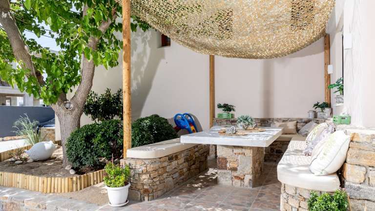 Die Maria's Residence bietet einen gepflegten Garten, in dem Sie sich entspannen und die griechische Sonne genießen können. Der Strand vor der Unterkunft bietet Ihnen die Möglichkeit, im kristallklaren Wasser zu schwimmen oder an verschiedenen Wassersportaktivitäten teilzunehmen. In der Umgebung können Sie auch Wandern, Radfahren oder Bootstouren unternehmen. Der Reinigungsservice erfolgt alle 2 Tage, damit Sie sich um nichts kümmern müssen.