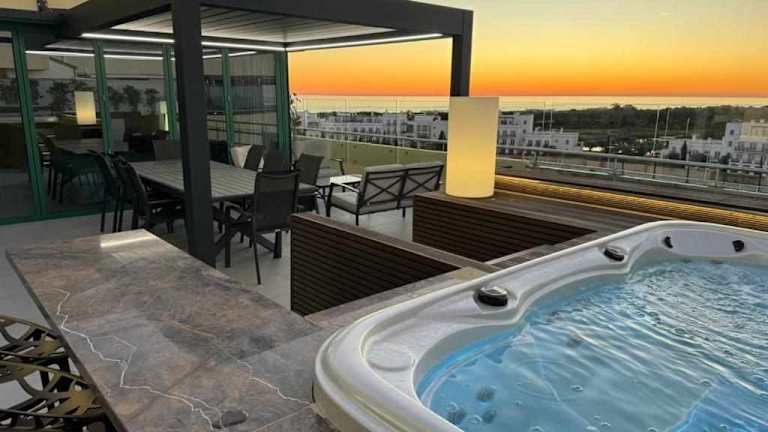 Marina Vilamoura Penthouse Aquamar 606 bietet klimatisierte Übernachtungsmöglichkeiten mit einem Balkon und kostenlosem WLAN. Die Ferienwohnung verfügt über einen Whirlpool und ermöglicht einen Blick auf den Pool sowie das Meer.