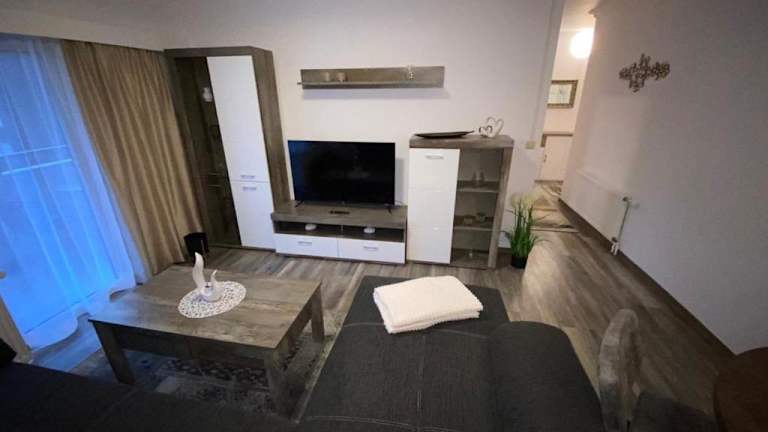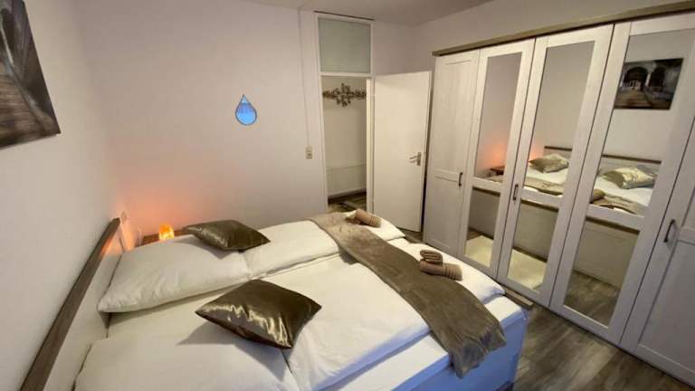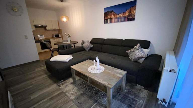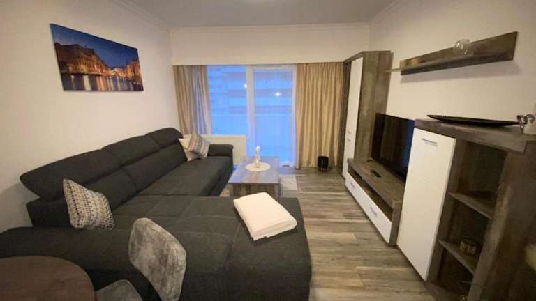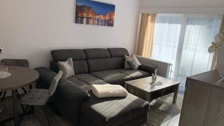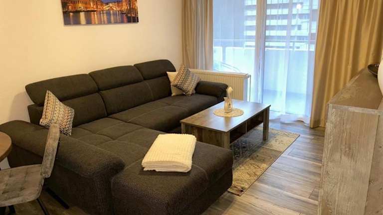 Die Ferienwohnung verfügt über ein Schlafzimmer und ist mit einer Küche ausgestattet, die einen Kühlschrank und Geschirrspüler bietet. Ein Flachbild-TV sowie ein Sitzbereich sind ebenfalls vorhanden. Das Badezimmer ist mit einer Dusche ausgestattet. Handtücher und Bettwäsche werden gestellt. Ein Balkon sowie eine Kaffeemaschine ergänzen die Ausstattung.
