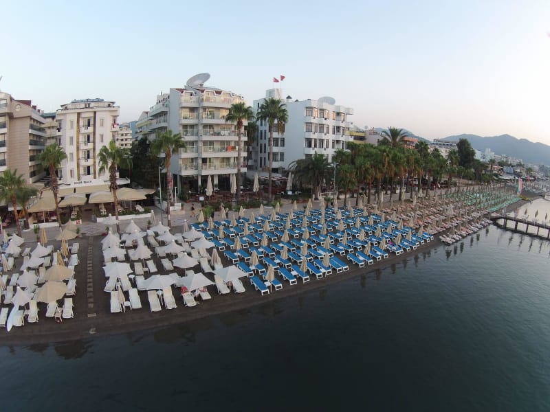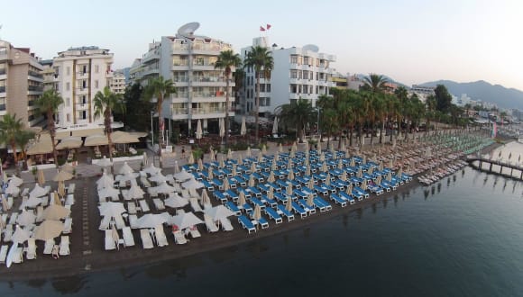 Das Begonville Beach Hotel ist ein charmantes Hotel direkt an der Strandpromenade von Marmaris. Hier können Sie einen erholsamen Urlaub verbringen und die entspannte Atmosphäre genießen. Die modernen Zimmer bieten allen Komfort, den Sie für einen angenehmen Aufenthalt benötigen. Das Hotel verfügt über eine Vielzahl von Restaurants, in denen Sie regionale und mediterrane Küche genießen können. Entspannen Sie am Strand oder am Pool und lassen Sie sich von dem freundlichen Personal verwöhnen.
