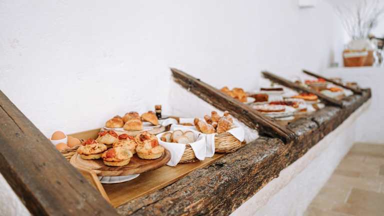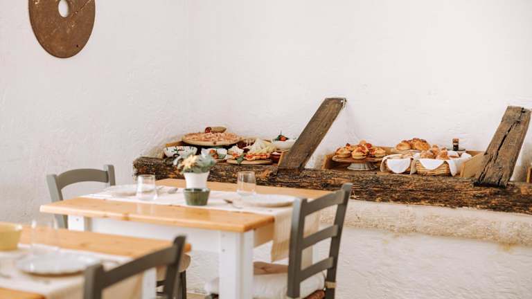 Das Frühstücksbuffet umfasst regionale Produkte wie Müsli, Kekse, hausgemachte Marmeladen, Käse, Aufschnitt, Speck und Eier. Getränke wie Fruchtsäfte sind ebenfalls erhältlich. Das Gourmetrestaurant serviert typische regionale und mediterrane Küche. Für besondere Ernährungsbedürfnisse kann auf Anfrage gesorgt werden, und die Unterkunft bietet Kochkurse sowie Ölverkostungen an.