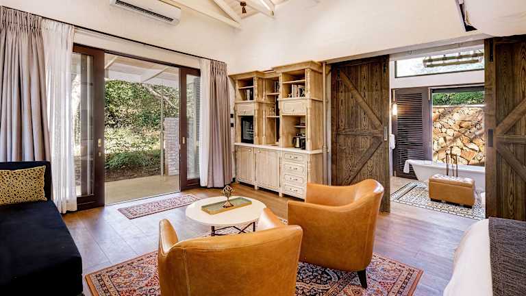 Die Zimmer sind klimatisiert und verfügen über moderne Annehmlichkeiten wie WLAN, Flachbild-TV, Minibar, Schreibtisch und ein eigenes Badezimmer mit Dusche. Die Deluxe King Zimmer bieten einen Gartenblick, ein King-Size Bett sowie eine eigene Terrasse oder einen Balkon mit Sitzgelegenheiten. Zusätzliche Ausstattungen umfassen einen Safe, Wasserkocher und Handtücher.