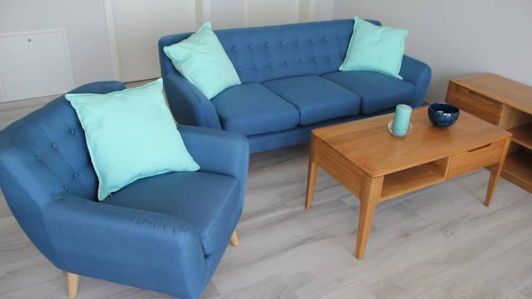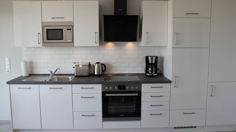 Die Unterkunft ist mit einer Küchenzeile ausgestattet, die unter anderem über einen Kühlschrank, einen Geschirrspüler, einen Ofen, eine Kaffeemaschine und einen Wasserkocher verfügt.
