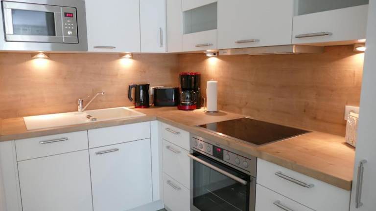 Die Ferienwohnung ist mit einer voll ausgestatteten Küche ausgestattet, die einen Kühlschrank, einen Geschirrspüler, eine Waschmaschine, einen Ofen und eine Mikrowelle beinhaltet.