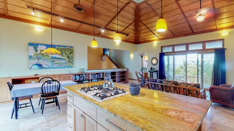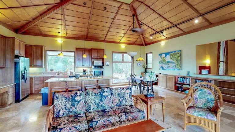 Das Mele Kai in Keaau bietet eine komfortable Unterkunft in einer ruhigen Umgebung. Mit einem schönen Garten und kostenfreiem WLAN können Gäste hier einen erholsamen Aufenthalt genießen. Die Nähe zu verschiedenen Sehenswürdigkeiten wie dem Lava Tree State Monument und dem Pana'ewa Rainforest Zoo macht dieses Ferienhaus zu einem idealen Ausgangspunkt, um die Umgebung zu erkunden. Mit drei Schlafzimmern, drei Badezimmern und einer voll ausgestatteten Küche bietet das Ferienhaus allen Komfort, den man sich wünscht. Entspannen Sie auf der Terrasse mit Blick auf den Pool und erleben Sie einen unvergesslichen Aufenthalt im Mele Kai.