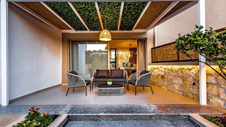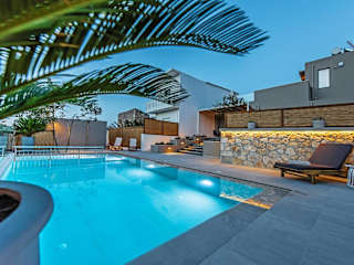 Die Villa bietet eine Sonnenterrasse sowie einen Außenpool. Zudem stehen Gartenmöbel, Sonnenstühle und Sonnenschirme zur Verfügung.