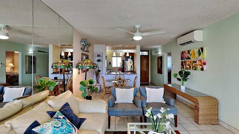 Menehune Shores 206 bietet eine Ferienwohnung mit Meerblick und einem Außenpool. Die Unterkunft verfügt über ein Restaurant und eine Bar, sowie klimatisierte Räumlichkeiten. Eine detaillierte Bestätigung mit Zahlungsinformationen wird nach vollständiger Bezahlung angeboten.