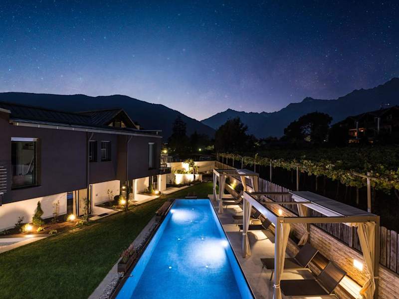 Entspannen Sie in Ihrem eigenen Garten oder genießen Sie die Sonne auf den Sonnenliegen am gemeinsamen Pool. Der Außenpool bietet eine erfrischende Abkühlung an warmen Tagen. Wenn Sie die Umgebung erkunden möchten, können Sie die Gärten des Schlosses Trauttmansdorff besuchen oder einen Ausflug zu den Thermalbädern von Meran unternehmen. Jedes Apartment verfügt über einen Stellplatz in der Garage der Unterkunft, so dass Sie Ihr Auto sicher und bequem parken können.