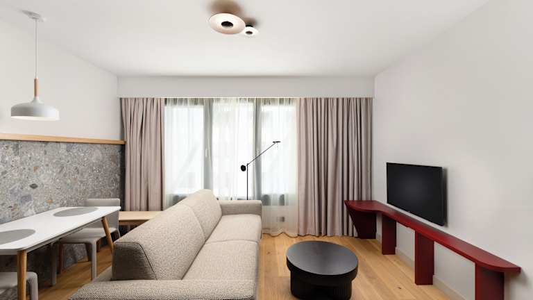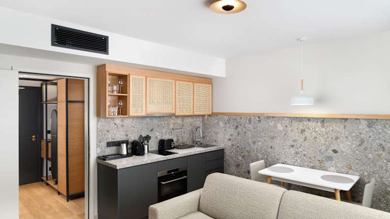 Einige Zimmer sind mit einer Küche ausgestattet, die über einen Kühlschrank, einen Geschirrspüler und einen Ofen verfügt. Bestimmte Zimmer bieten zusätzlich zur standardmäßigen Ausstattung auch eine Sauna.
