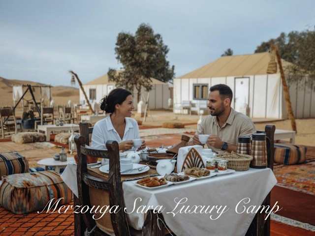 Das Merzouga Sara Luxury Camp ist eine luxuriöse Unterkunft mit umfänglichen Annehmlichkeiten, darunter eine rund um die Uhr besetzte Rezeption, einen Zimmerservice sowie kostenloses WLAN in der gesamten Anlage. Die Unterkunft zeichnet sich durch private Balkone aus und bietet einen Garten sowie eine Terrasse. Aktivitäten wie Skifahren und der Zugang zu einer Skischule sind ebenfalls vorhanden. Eine Nichtraucherpolitik wird in allen öffentlichen und privaten Bereichen eingehalten.