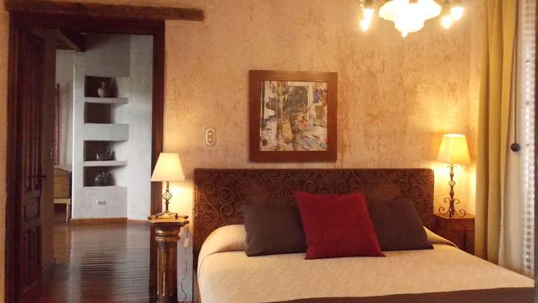 Das Meson Panza Verde in Antigua Guatemala ist eine charmante Unterkunft im europäischen Stil, die mit üppigen Gärten, einer Kunstgalerie und einer atemberaubenden Dachterrasse mit Panoramablick beeindruckt. Nur vier Blocks entfernt befinden sich der Zentralpark und die Kathedrale von Antigua Guatemala. Die eleganten Zimmer des Meson Panza Verde sind mit einem gemütlichen Kamin und einem komfortablen Sitzbereich ausgestattet. Einige Suiten bieten sogar eine Whirlpool-Badewanne. Kostenloses WLAN steht Ihnen in allen Bereichen zur Verfügung. Im hoteleigenen Restaurant können Sie sich auf internationale Köstlichkeiten freuen, während Sie morgens ein kostenloses Frühstück mit duftendem Kaffee genießen können. Eine Bar ist ebenfalls vorhanden. Die Unterkunft liegt etwa 40 km von Guatemala-Stadt und dem internationalen Flughafen Guatemala entfernt. Der malerische See Atitlan ist weniger als 130 km entfernt.