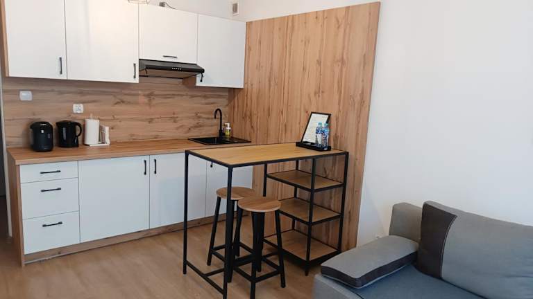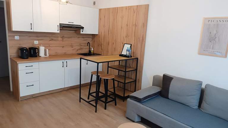 Die Ferienwohnung besteht aus einem Schlafzimmer, einem Wohnzimmer sowie einer voll ausgestatteten Küche, die einen Kühlschrank und einen Wasserkocher beinhaltet. Zudem steht den Gästen ein Badezimmer mit einer Dusche und einem Haartrockner zur Verfügung. Handtücher und Bettwäsche werden bereitgestellt.