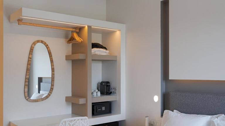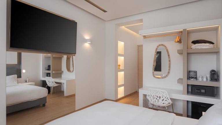Die klimatisierten Zimmer des Mirada Hotels sind modern eingerichtet und in lebhaften Farben gehalten. Die Zimmer sind mit Pop-Art-Tapeten und Gemälden des berühmten Künstlers Roy Lichtenstein dekoriert. Zur Ausstattung gehören ein Flachbild-Sat-TV, ein DVD-Spieler und kostenfreies WLAN. Die Badezimmer sind modern und verfügen entweder über eine Dusche oder eine Badewanne. Hausschuhe und kostenfreie Pflegeprodukte stehen ebenfalls zur Verfügung. Einige Zimmer bieten zudem einen Balkon mit Blick auf den Saronischen Golf.