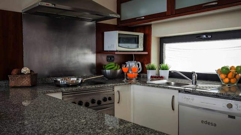 Die gut ausgestattete Küche in jeder Villa ermöglicht es, eigene Mahlzeiten zuzubereiten. Dazu gehören ein Geschirrspüler und eine Waschmaschine mit Trockner. Die Grilleinrichtungen im Garten können ebenfalls genutzt werden.