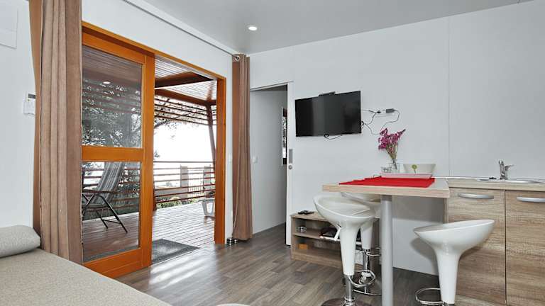 Die Unterkunft Mobile home Kalcit ist ein klimatisiertes Ferienhaus mit einer insgesamt komfortablen Ausstattung. Es besteht aus 2 Schlafzimmern, einem Wohnzimmer und einer voll ausgestatteten Küchenzeile. Neben der komfortablen Einrichtung bietet das Ferienhaus auch einen kostenlosen Privatparkplatz sowie kostenloses WLAN in der gesamten Anlage.