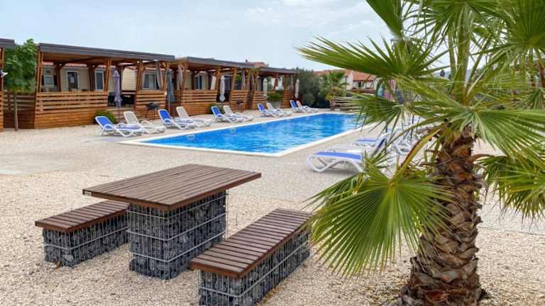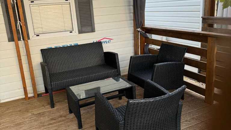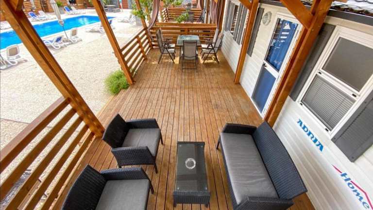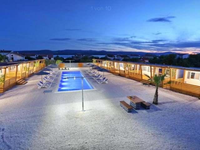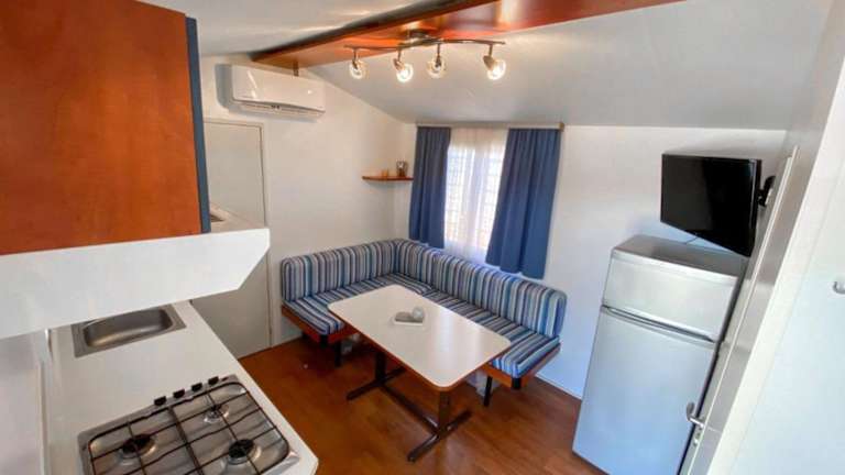Mobilheim Camping 6 Personen Pool am Meer bietet kostenloses WLAN, Grillmöglichkeiten und einen saisonalen Außenpool. Es stehen außerdem kostenlose Privatparkplätze zur Verfügung. Die Unterkunft ist für bis zu sechs Personen ausgelegt und verfügt über eine Terrasse.
