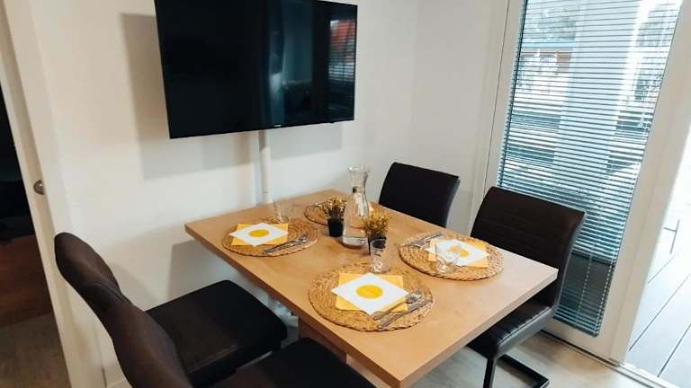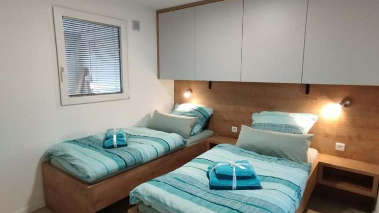 Das Mobilheim umfasst zwei Schlafzimmer, ein Wohnzimmer mit Essbereich, eine Küchenzeile mit Kühlschrank sowie ein Flachbild-TV. Die Ferienwohnung ist klimatisiert und bietet Handtücher und Bettwäsche. Nichtraucherzimmer sind vorhanden.