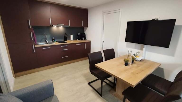Es besteht die Möglichkeit, Essen in die Unterkunft liefern zu lassen. Eine Küchenzeile in der Ferienwohnung ermöglicht Selbstverpflegung.