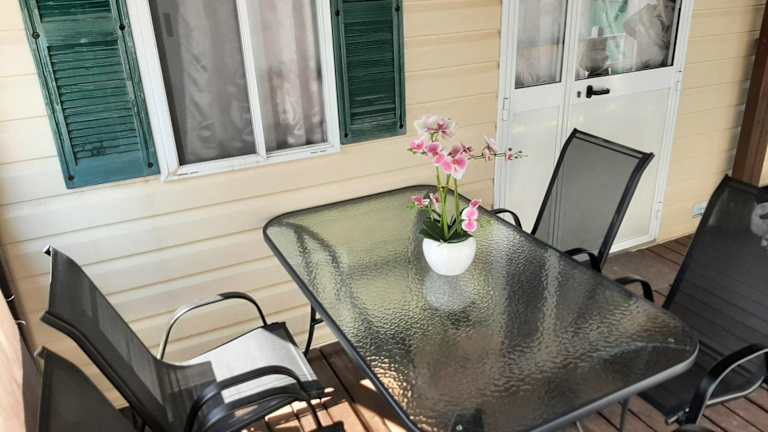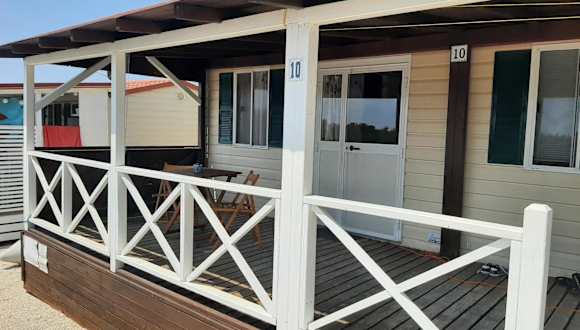 Das Mobilhome verfügt über zwei Schlafzimmer und bietet eine Klimaanlage. Zur Ausstattung gehören ein Satelliten-Flachbild-TV sowie eine voll ausgestattete Küche, die mit einem Kühlschrank und einem Ofen ausgestattet ist. Die Unterkunft bietet zudem eine Terrasse und ist für Familien geeignet.