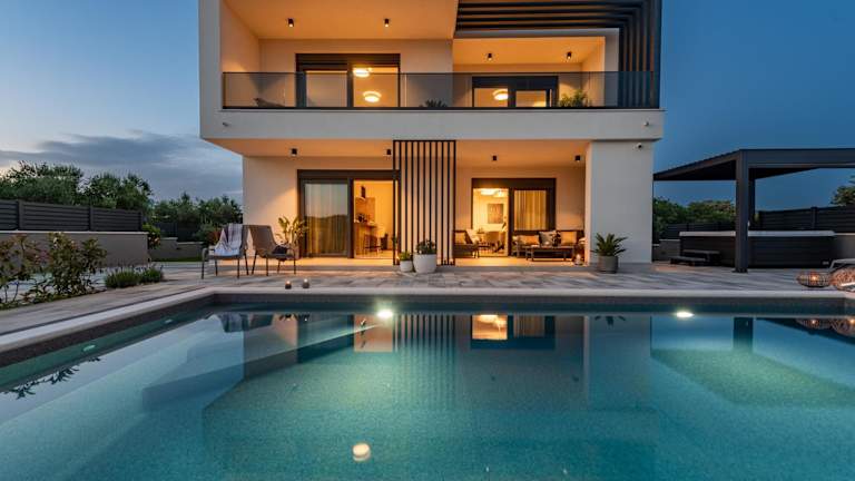 Die Villa umfasst eine voll ausgestattete Küche mit Kühlschrank und Geschirrspüler. Zu den weiteren Ausstattungsmerkmalen gehören ein Flachbild-TV, Sitzbereiche und private Badezimmer mit Duschen. Handtücher und Bettwäsche sind vorhanden. Eine Unterkunft im familienfreundlichen Rahmen mit Nichtraucherzimmern ist gegeben.