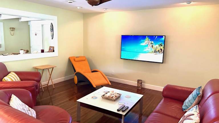 Das Modern Luxury Beach House Kailua bietet 2 geräumige Schlafzimmer, in denen Sie sich nach einem ereignisreichen Tag erholen können. Die voll ausgestattete Küche verfügt über einen Kühlschrank und einen Geschirrspüler, so dass Sie Ihre eigenen Mahlzeiten zubereiten können. Der Flachbild-TV und der komfortable Sitzbereich bieten Ihnen Unterhaltung und Entspannung. Das Ferienhaus verfügt auch über 3 Badezimmer mit Dusche. Handtücher und Bettwäsche werden gestellt, so dass Sie leicht reisen können.