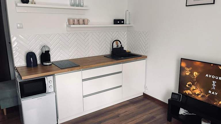 Das Apartment im Moderna Apartament verfügt über ein Schlafzimmer, eine voll ausgestattete Küche mit einem Kühlschrank und einer Mikrowelle, einen gemütlichen Sitzbereich und ein Badezimmer mit Dusche. Handtücher und Bettwäsche werden gestellt, um Ihren Aufenthalt so angenehm wie möglich zu gestalten.