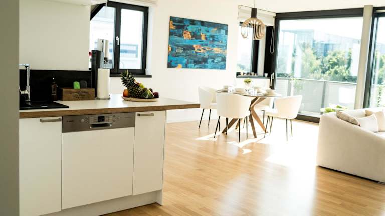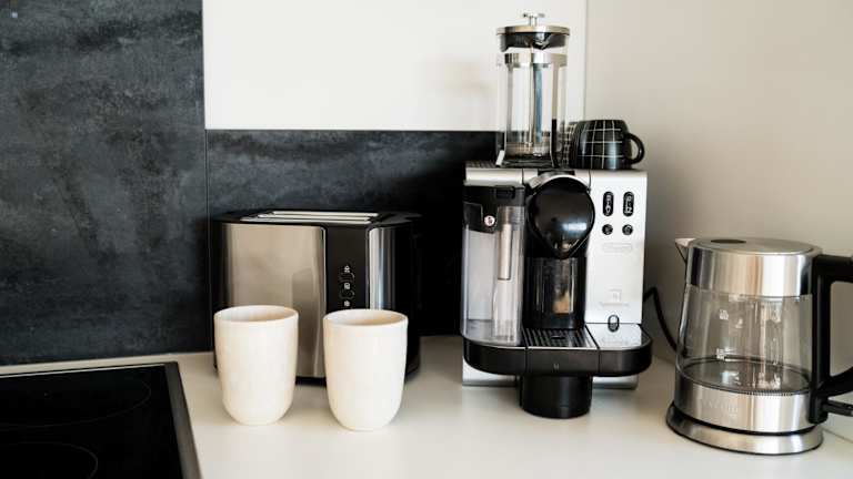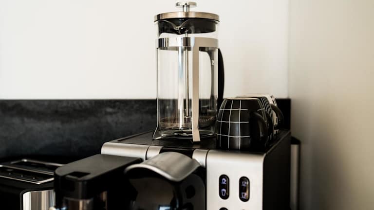 Die Ferienwohnung verfügt über eine voll ausgestattete Küche mit Kühlschrank und Kaffeemaschine, was die Selbstverpflegung ermöglicht. Es sind keine weiteren Verpflegungsmöglichkeiten angegeben.